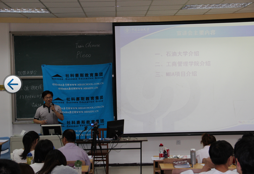 2014年6月7日中国免费靠逼视频(北京)MBA招生宣讲会走进北京语言大学--社科赛斯教育集团MBA备考考生课堂。石大工商管理学院副院长、MBA教育中心主任郭海涛博士首先对免费靠逼视频做了概括性介绍,并就石大MBA项目的现状、录取人数、招生政策、学费等几个方面集中说明了MBA报考及培养中同学们关心的问题。他指出,石大MBA在能源领域有着独特的学科优势,6大能源特色课程帮助学员提高专业素养,在石大学习MBA的收获之一是可以快速结识到能源领域的人脉,对于今后的职业选择是非常有好处的。