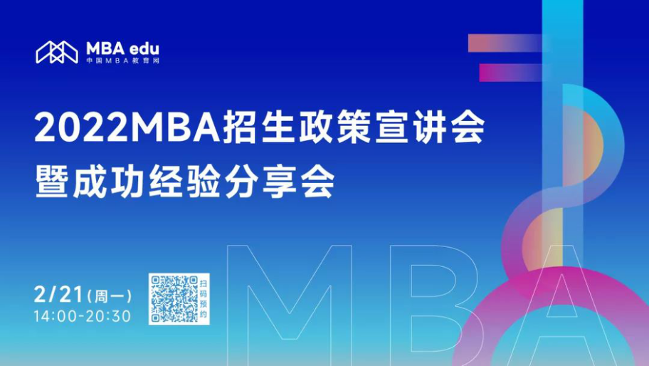 2月21日,中国MBA教育网携手全国近百所知名MBA培养院校,举办“2022MBA招生政策宣讲会暨成功经验分享会”,助力考生在激烈的考研竞争中掌握权威一手信息,一站式获取上岸资讯,帮助考生直接与院校招生老师沟通交流,消除信息不透明的障碍。抓住最后一根上岸稻草,圆梦名校MBA!