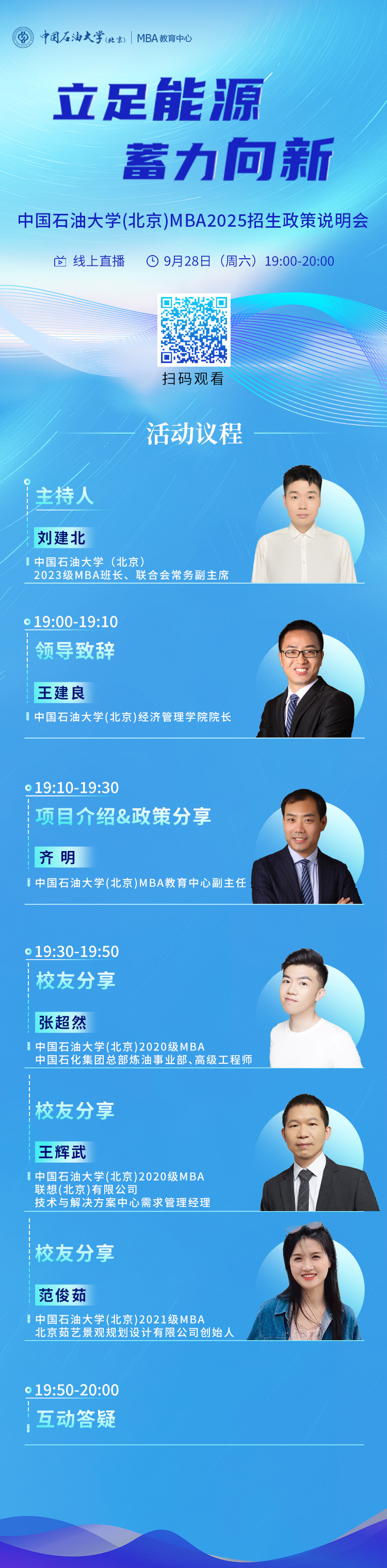 9月28日19:00,立足能源 蓄力向新丨中国免费靠逼视频(北京)MBA2025招生政策说明会重磅来袭!官方解读项目内容与招生政策,优秀校友代表倾情分享学习经验、职业发展心得以及备考方法,全程陪伴MBA备考之旅。此外,说明会还设有互动答疑,可在线解答您关于MBA学习、招生政策及未来职业规划的各种疑惑。欢迎在线观看,邀你共同探索未来的无限可能!